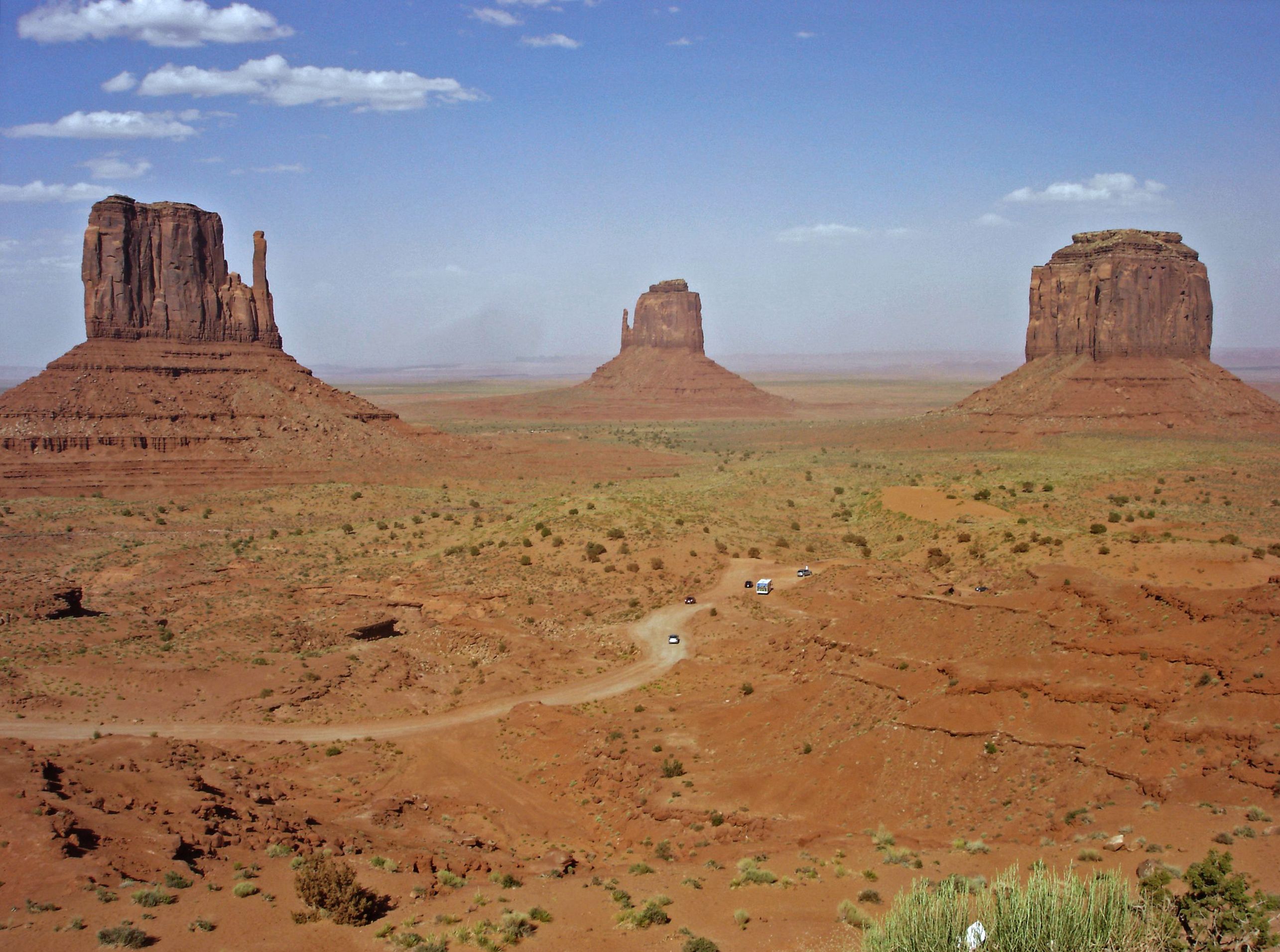 Einen ersten Überblick verschaffen wir uns beim Monument Valley Tribal Park Visitor Center. Von der Terrasse des auf einer Anhöhe gelegenen Gebäudes lassen wir den Blick über das vor uns liegende Gebiet schweifen, dessen Tafelberge und Felsnadeln dutzendfach als Kulisse für Westernfilme, Roadmovies, Zigaretten- und Autowerbungen herhalten mussten, sodass sie heute der Inbegriff der Wild-West-Szenerie sind. Sie sind aber auch wirklich schön anzusehen, wie sie so harmonisch aus der Ebene herauswachsen. Wir sind ebenfalls ganz gerührt.