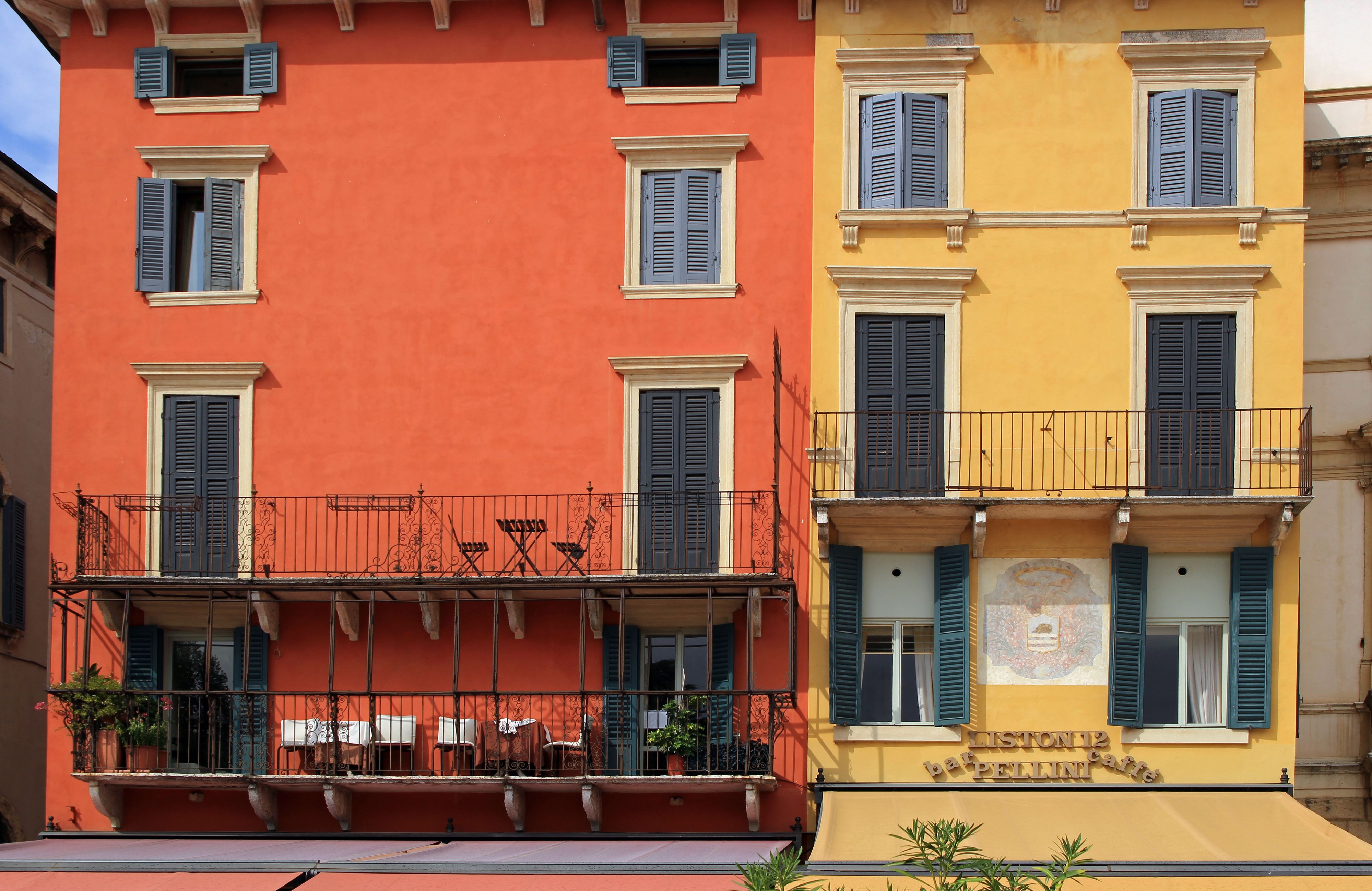 Das coronabedingten Fehlen der Touristenströme trägt sicher auch dazu bei. Das antike Baudenkmal und die in typischen Gelb- und Rottönen gehaltenen Gebäude mit ihren noch typischeren grünen Fensterläden harmonieren gut miteinander. Die Stadtmöblierung erinnert uns daran, dass Verona aber noch aus anderen Gründen weltbekannt ist.