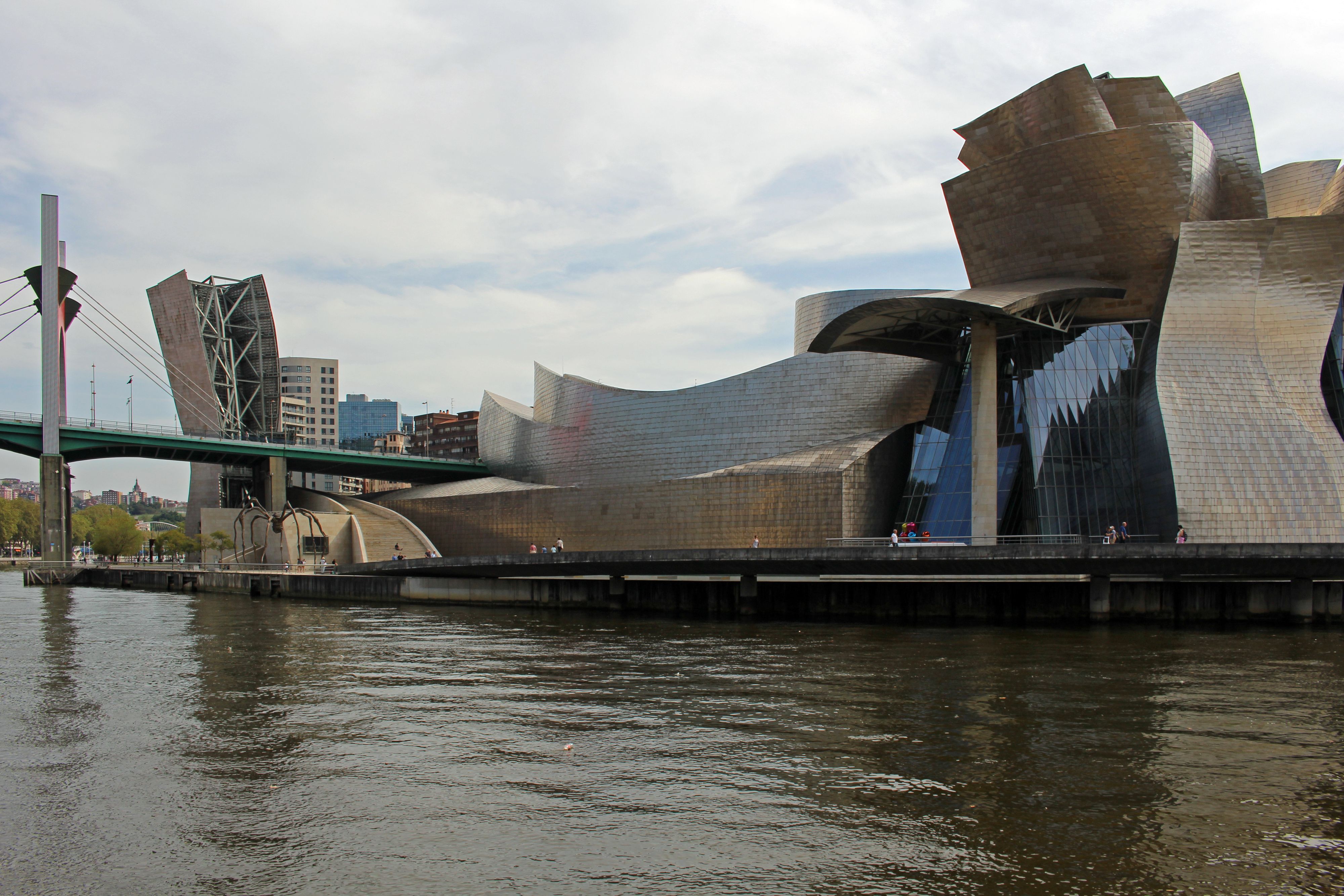 Am Flussufer ist es leider nicht mehr so schattig wie in der Altsadt und da heute ein wirklich extrem heißer und schwüler Tag ist, kommen wir bei unserer City-Tour ordentlich ins Schwitzen. Wir kommen an der Zubizuri-Brück von Architekt Santiago Calatrava vorbei und dann eröffnet sich uns schon bald der Blick auf Frank Gehrys Guggenheim-Museum.