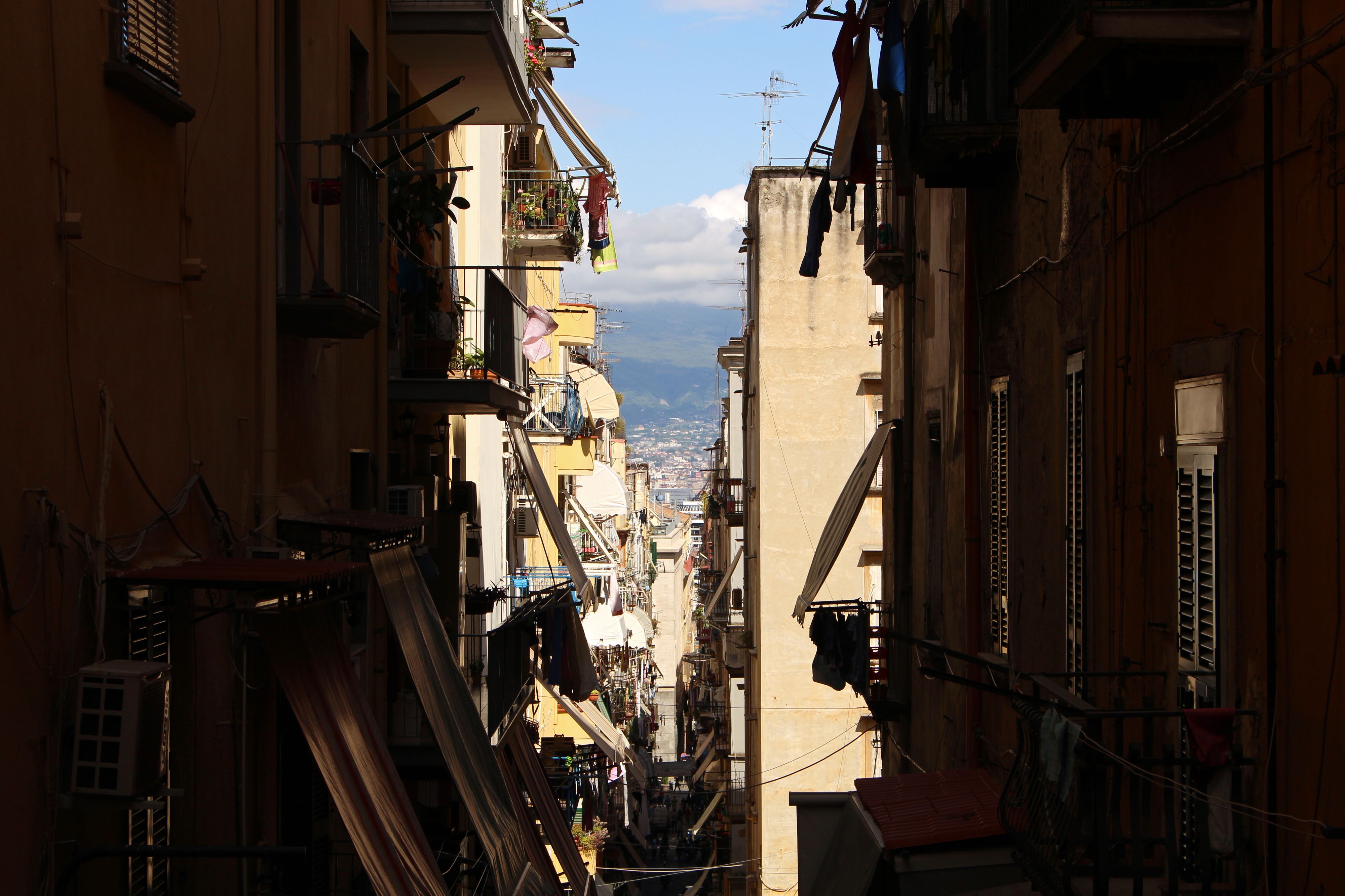 Nachdem wir uns am Vesuv sattgesehen haben, wollen wir ein ganz spezielles Stadtviertel erkunden, das irgendwie nicht nur der Inbegriff von Neapel sondern unserer stereotypen Gesamtvorstellung Italiens ist. Enge, über und über mit Wäscheleinen überspannte Gassen, hupende Vespafahrer, am Straßenrand sitzende Omas und Opas, Tricolore, göttlich duftende Pizzabuden mit Holzofen, Italopop-Klänge, die durch die Gassen schallen und, und, und. Es gibt kein Italien-Klischee, das im Quartieri Spagnoli ausgelassen wird. Obwohl wir schon viel von diesem Viertel erwartet haben, gefällt es uns außerordentlich gut. Nicht nur, aber auch wegen der Klischees. Was besonders beeindruckend ist, ist die Bausubstanz, die sich - im Gegensatz zu den oft sehr herausgeputzten Bauten der Stadterneuerungsphase - ihre Authentizität bewahrt hat. Hier ist nichts zu Tode restauriert oder gentrifiziert. Das Quartieri Spagnoli ist tatsächlich noch ein traditionelles, sehr dicht besiedeltes und ärmeres Viertel, das auch nicht den besten Ruf hat. Uns gefällt es vielleicht gerade deswegen so gut. Da es an den Hängen des Hügels Vomero erbaut ist bieten sich von den weiter oben liegenden Gassen durch die engen Häuserschluchten teils atemberaubenden Ausblicke auf die Stadt und den Golf von Neapel.